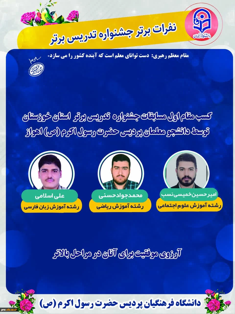 امتیاز دهید : افتخار آفرینی دانشجو معلمان در مسابقات جشنواره تدریس برتر 2 شنبه 16 اردیبهشت 1402 ساعت 8:23