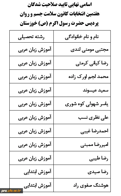 اسامی نهایی تایید صلاحیت شدگان هفتمین انتخابات کانون سلامت جسم و روان پردیس حضرت رسول اکرم 2